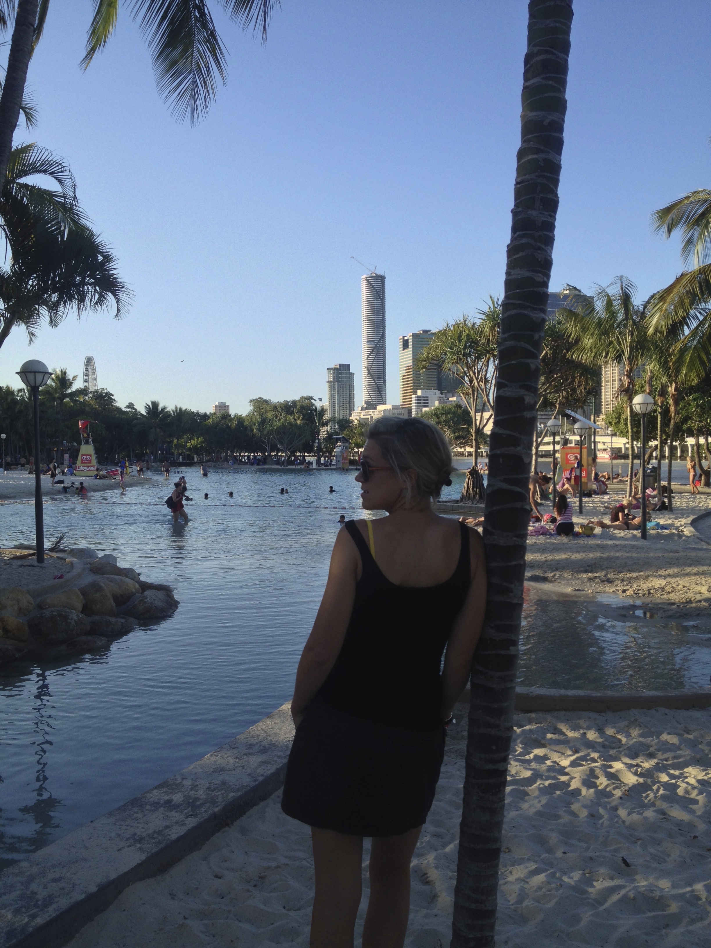 De South Bank van Brisbane is een aangename en verkoelende verrassing. Een artificieel aangelegd meer en strand vlak aan de Brisbane River en met panoramisch uitzicht op de skyline. Schoenen uit en pootje baden!